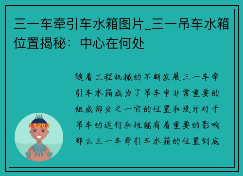 随着工程机械的不断发展,三一车牵引车水箱成为了吊车中非常重要的组成部分之一。它的位置和设计对于吊车的运行和性能有着重要的影响。那么,三一车牵引车水箱的位置到底在哪里呢?本文将从多个方面对三一车牵引车水箱位置进行详细阐述,揭秘其中心所在。